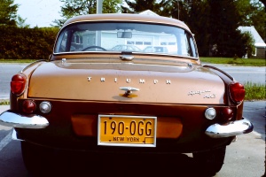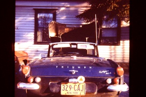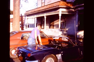 This was my first Spitfire. I bought it in 1973 for $600. Considering I was in the USAF making less than $500 a month, that felt like a lot of money at the time. It seemed like everything that could go wrong with this car, did. It leaked four quarts of oil a week (really). Had a lug bolt strip in the real wheel hub so I couldn't get the wheel off. Lost the same wheel - and hub - on a cold winter day (my own fault, I didn't replace the nylock nut on the axle when I fixed the lug bolt). Burned out a generator, burned out a starter, Sheared the axle key in the left rear hub while autocrossing. Blew out a u-joint on the right side. I couldn't afford a new exhaust system so I was patching up the pipes with beer cans and hose clamps about once a week. Then, when I finally got a new exhaust, I ran off the road in a nighttime rally and over a big rock and tore the brand new headpipe out of the mounting flange on the manifold. Oh, and it had massive amounts of rust - for a five year old car. I rebuilt the engine somewhere in all of that and bought a hardtop for it - which helped in for the NY winter. And just fixed things as they broke. I finally gave up on the car and sold it after the left front lower trunion blew out. Fortunately, I was pulling up to a stop sign at the time. The Spitfire was dark blue originally. The new owner did a lot of bodywork and repainted the car a metallic brown - with the hardtop on. I have very few pictures of it and actually found some slides of it from when the next guy owned it. Five or six years after I sold it, I ran into a woman scrounging a foreign car junkyard, looking for Triumph parts. Turns out, she had a '68 Mk III Spitfire. When she described the car I realized it was my old car. Her brother was redoing all the bodywork and repainting the car - red. I got to see it after he got done, but I don't have any photos. Oh, that's my old housemate in the photo... |